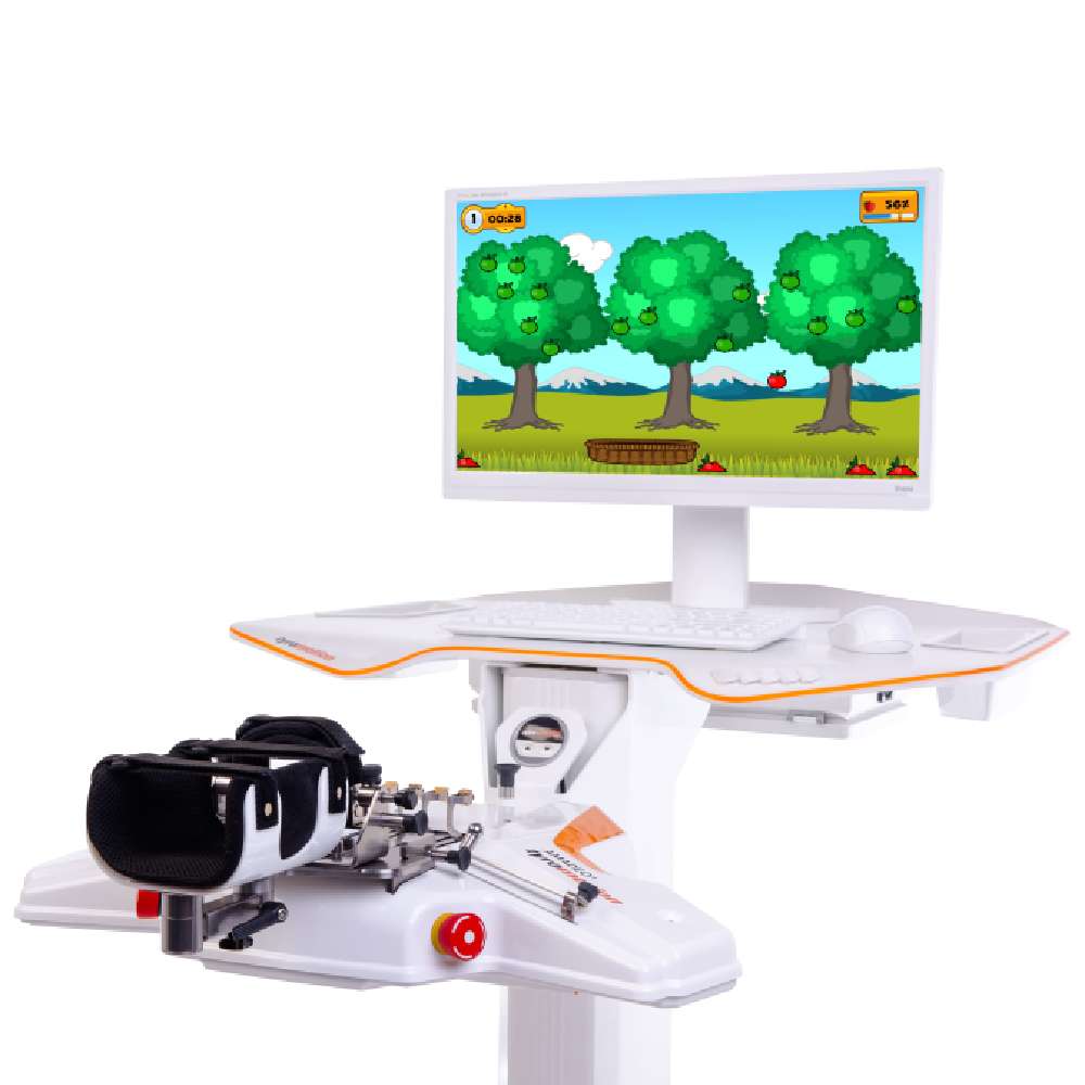 AMADEO® is a clinically tried and tested hand and finger robotic rehabilitation device that uses robotics and sensors to increase therapeutic ambition for individuals of all ages in all phases of rehabilitation. It is designed as an end effector exoskeleton that directly connects to the fingers and is stationary/fixed. The new design and specially developed tyroS software offer a broader range of therapy options, including assistive and interactive therapies for individual finger and thumb movements, EMG-based training, and passive, assistive, and active modes. AMADEO® supports the resolution of spasticity, testing of tactile sensibility, range of motion assessment, force assessment, spasticity assessment and treatment, movement therapies, sensitivity training, serious gaming in one- and two-dimensional movements, and surface electromyography. AMADEO® is easily adjustable to every patient’s needs, including height of the table, position of the hand unit in pronation and supination, and the spread of finger movement. Overall, AMADEO® is a unique, flexible, and highly effective rehabilitation device for hand and finger therapy.