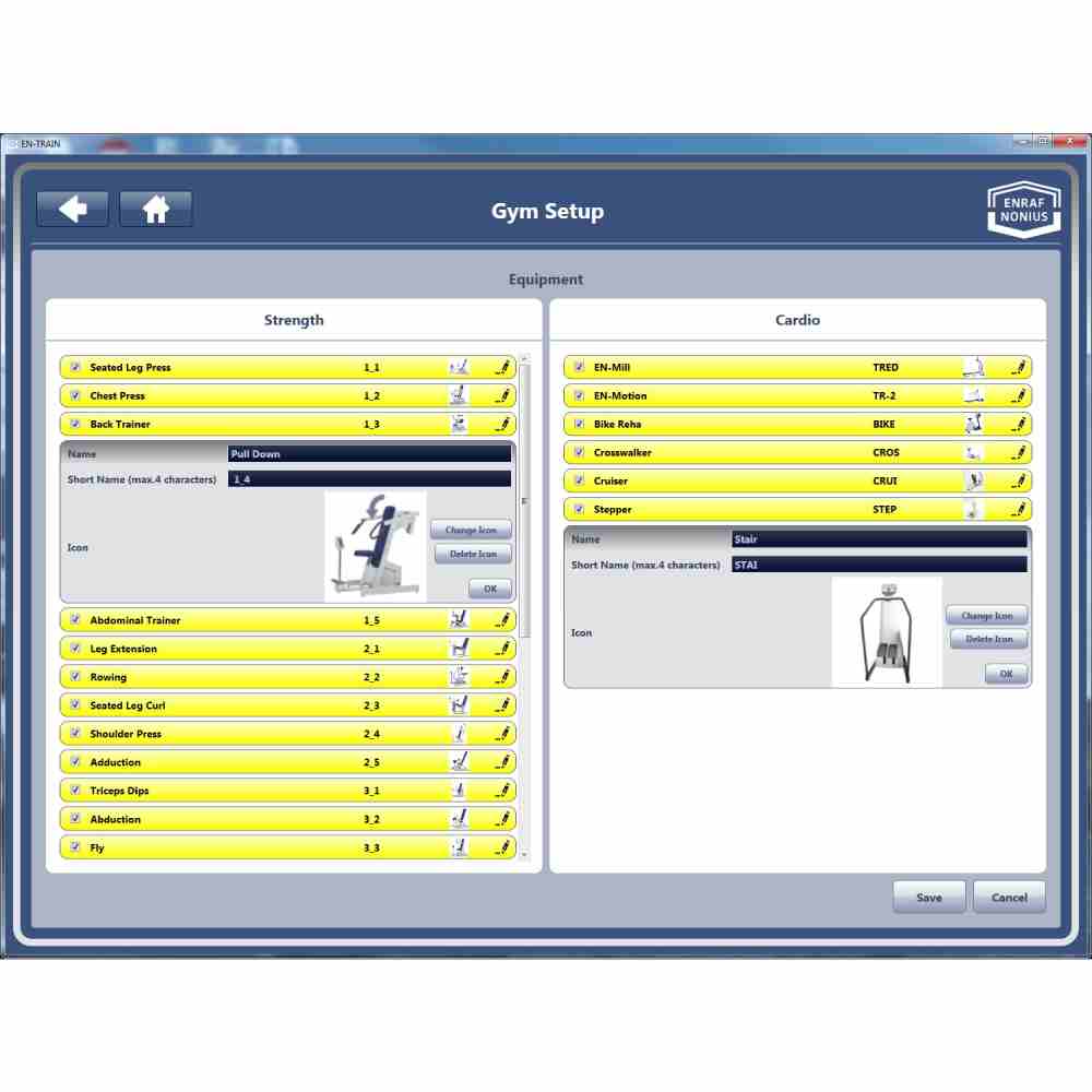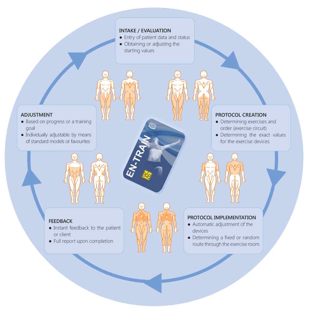 The program is user-friendly, with a chip card for entry of individual tests and training programs, and the storage of results. Users can obtain feedback on exercises performed and track progress at any time with extensive but clear reporting options. Additionally, the program is compatible with all Enraf-Nonius exercise machines fitted with a chip card reader, including EN-Dynamic strength training machines, EN-Cardio machines, and EN-Tree Pulley multifunctional machines.