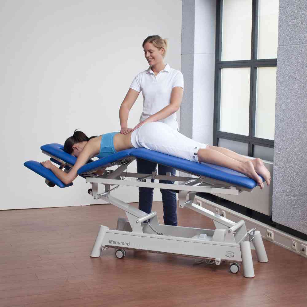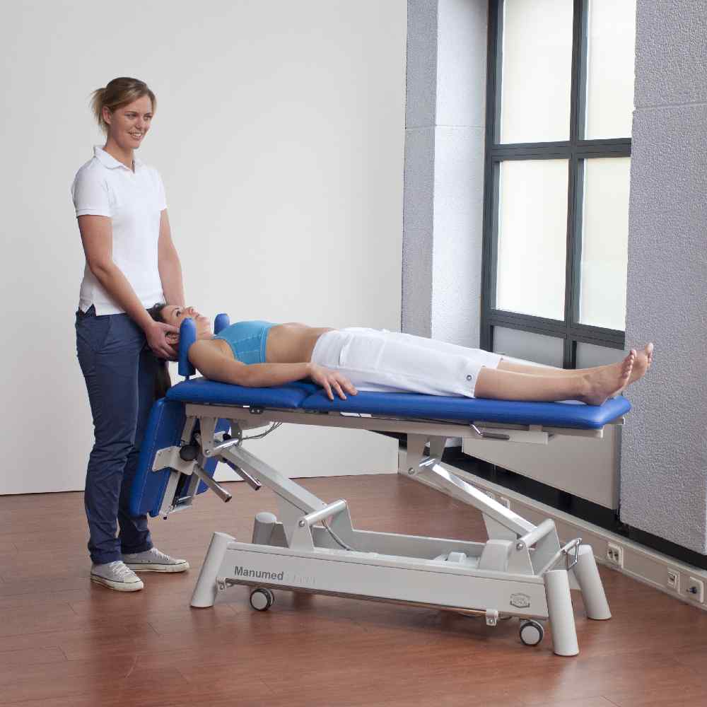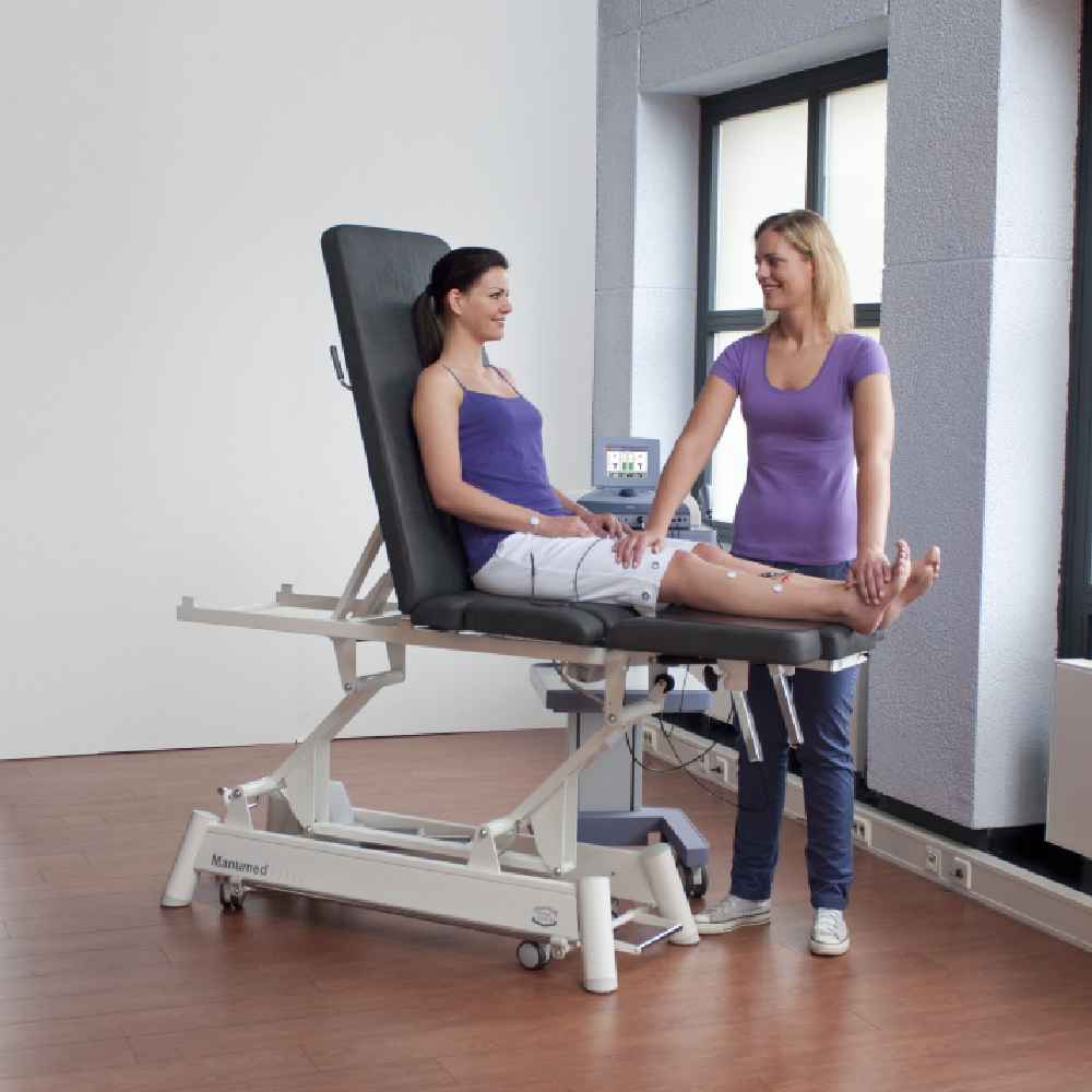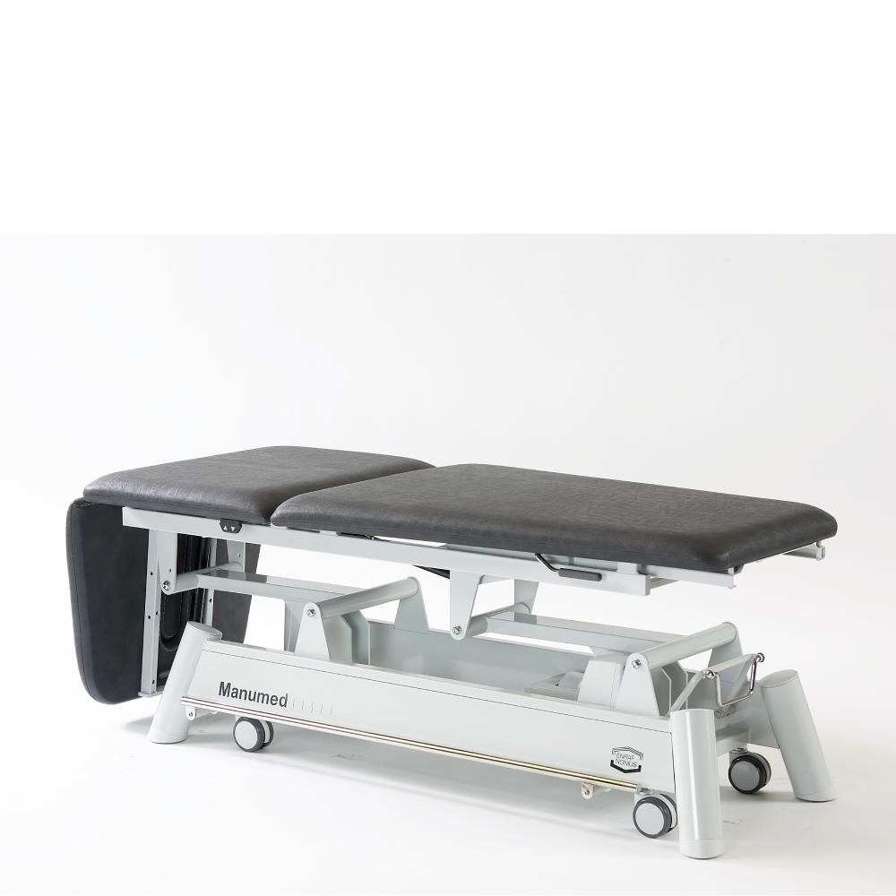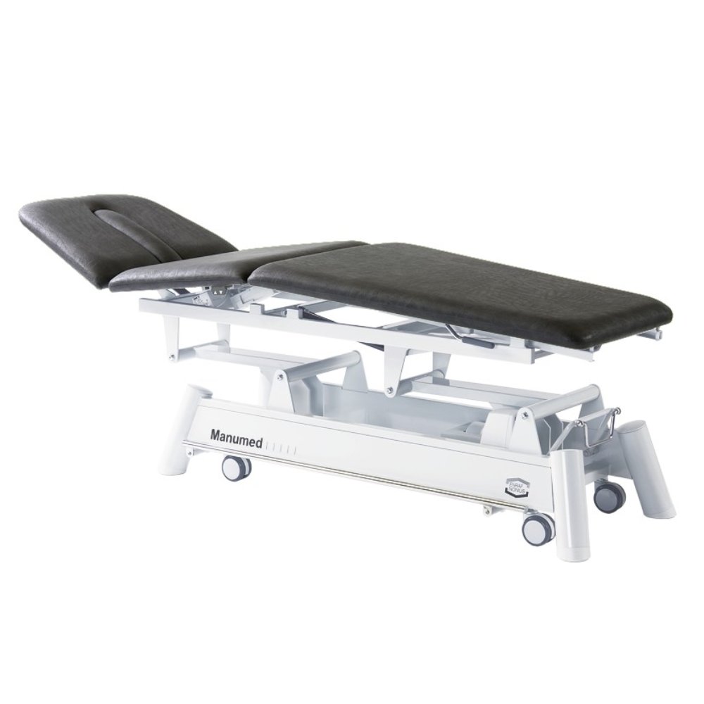 The Manumed Optimal 3-section treatment couch is a versatile and professional option for physiotherapists looking for a high-quality examination and treatment couch. It is designed to accommodate a wide range of positions, including lying and sitting positions, as well as the Trendelenburg and flexion positions. The couch is electrically adjustable and has a load capacity of up to 200 kg (250 kg in some models). The head section folds down completely to provide better access to the cervical region, while the optimally positioned handles and long nose hole allow for easy patient movement. The couch also has a wheel raising mechanism, making it easy to move around, and can be adjusted hydraulically or electrically for height.
